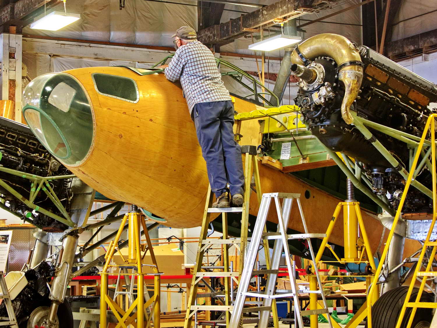 For now, the Mosquito waits. Its public assembly allows visitors to see what goes into building an airplane, which is a rare treat. The volunteers are proud of their work and quick with their own stories about the plane, why they give so much time and effort to build one, and why it’s an important aircraft to have.